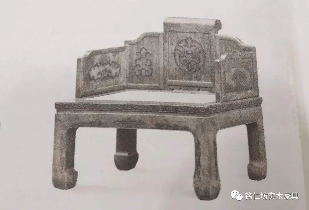 黃花梨嵌癭木五屏風(fēng)式寶座,寶座下部以厚重的大材做邊抹及腿,寬度達(dá)10厘米,也用楠木癭子作鑲嵌,花紋取自青銅器。座面還保留著原來用黃絲絨編織的菱形紋軟屜,密無孔目,因長(zhǎng)期受鋪墊的遮蓋保護(hù),色澤尤新。整體說來它裝飾富麗,氣勢(shì)雄偉,設(shè)計(jì)者達(dá)到了當(dāng)時(shí)統(tǒng)治者企圖通過寶座來顯示其特殊身份的要求。