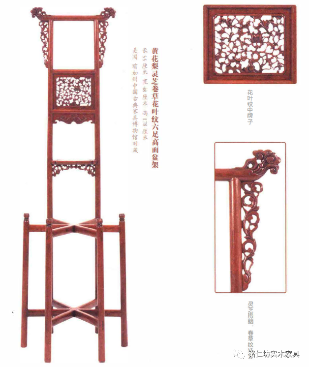 (黃花梨靈芝卷草花葉紋六足離面盆架)